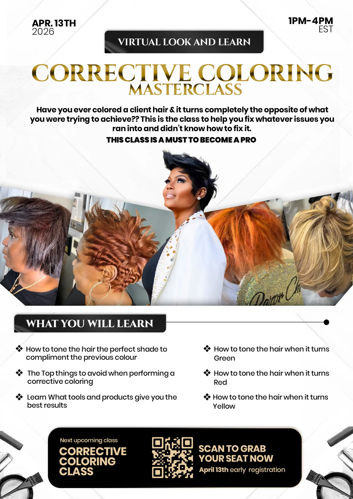The 'Corrective Coloring' Masterclass will take place on April 13th in Atlanta, GA, from 1 PM to 4 PM EST. A virtual ticket is also available for those who want to join from anywhere in the world.